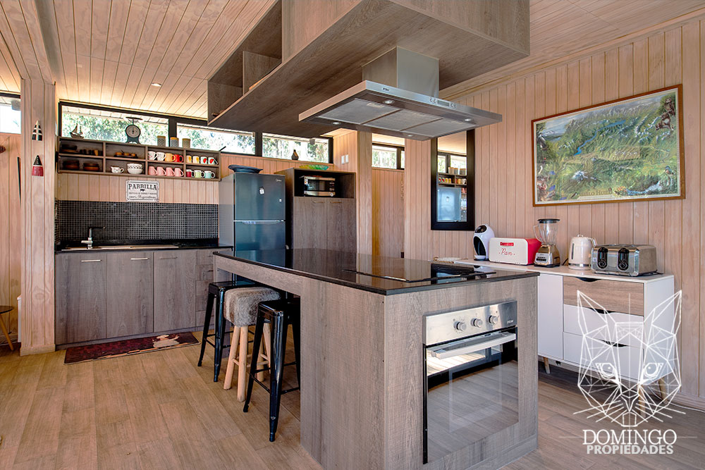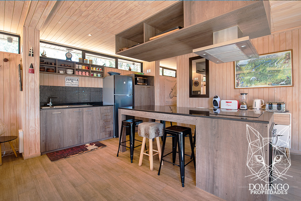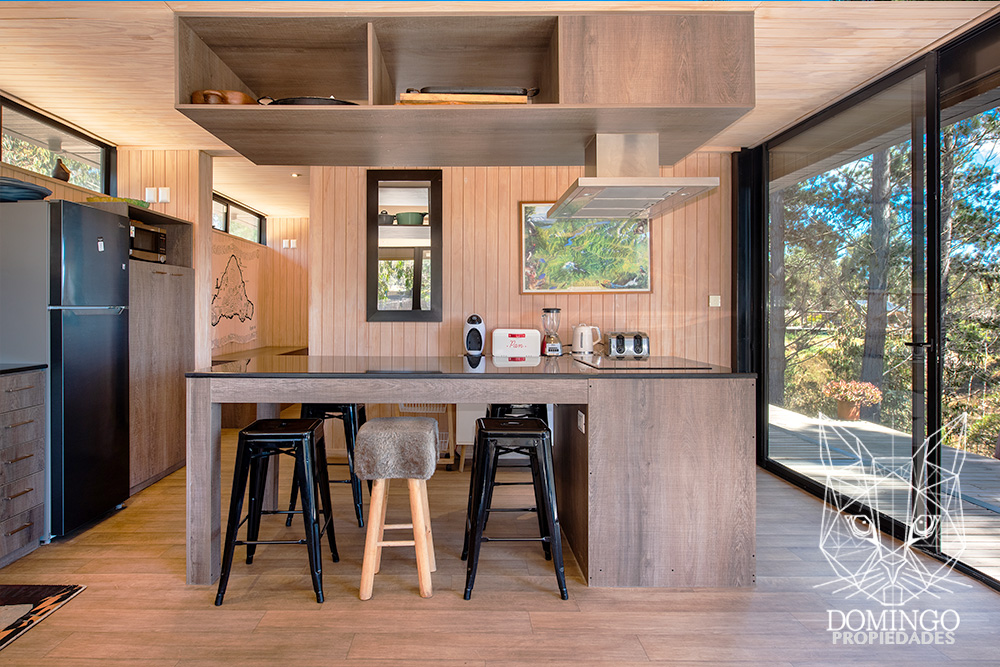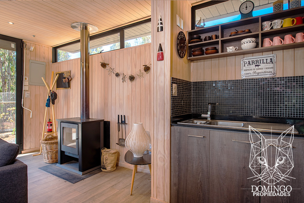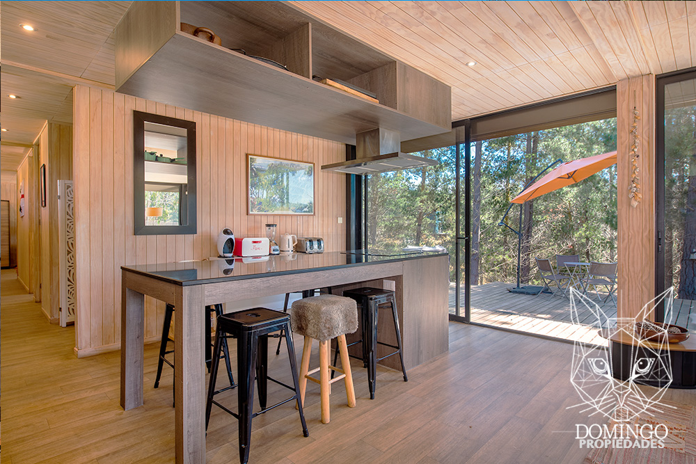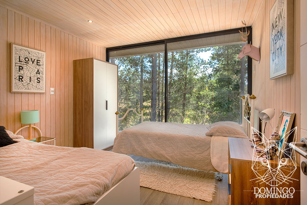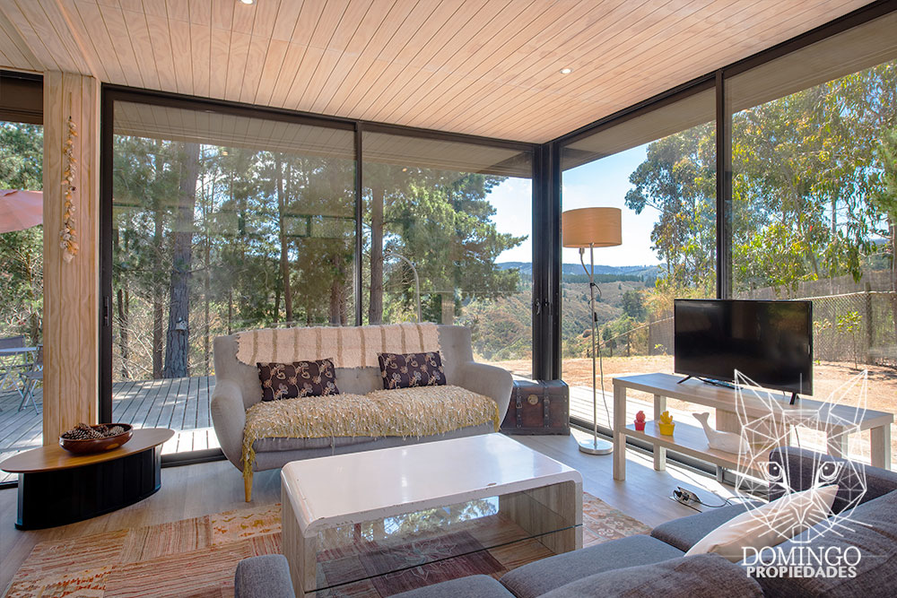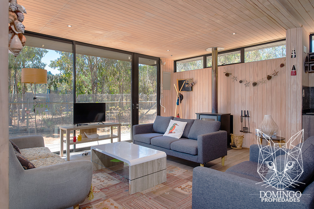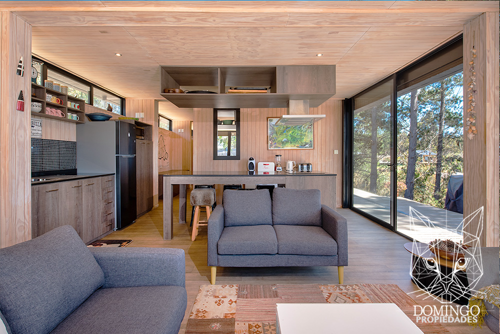 La casa de 90 m² se organiza en una nave central que integra el living, comedor y cocina, conectando a través de grandes ventanales termopanel con el paisaje exterior. Cada ventana cuenta con persianas eléctricas, lo que permite cerrar totalmente la casa para una mayor seguridad.